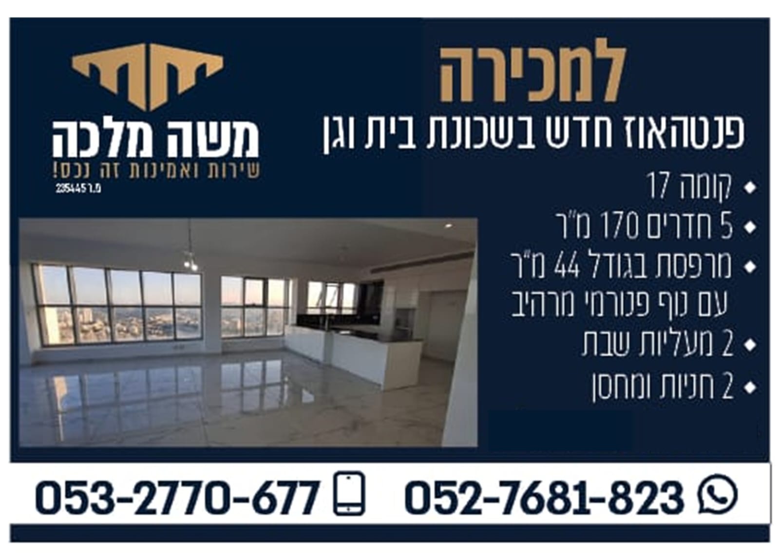 פנטאהוז מפואר חדש בשכונת בית וגן היוקרתית בקומה 17 בבנין 2 מעליות שבת 2 חניות בחניון ומחסן למבינים ובעלי יכולת ישנה אופציה להגדלה לפרטים ותמונות נוספות התקשרו עכשיו עכשיו במחיר מיוחד לאחר ירידת מחיר