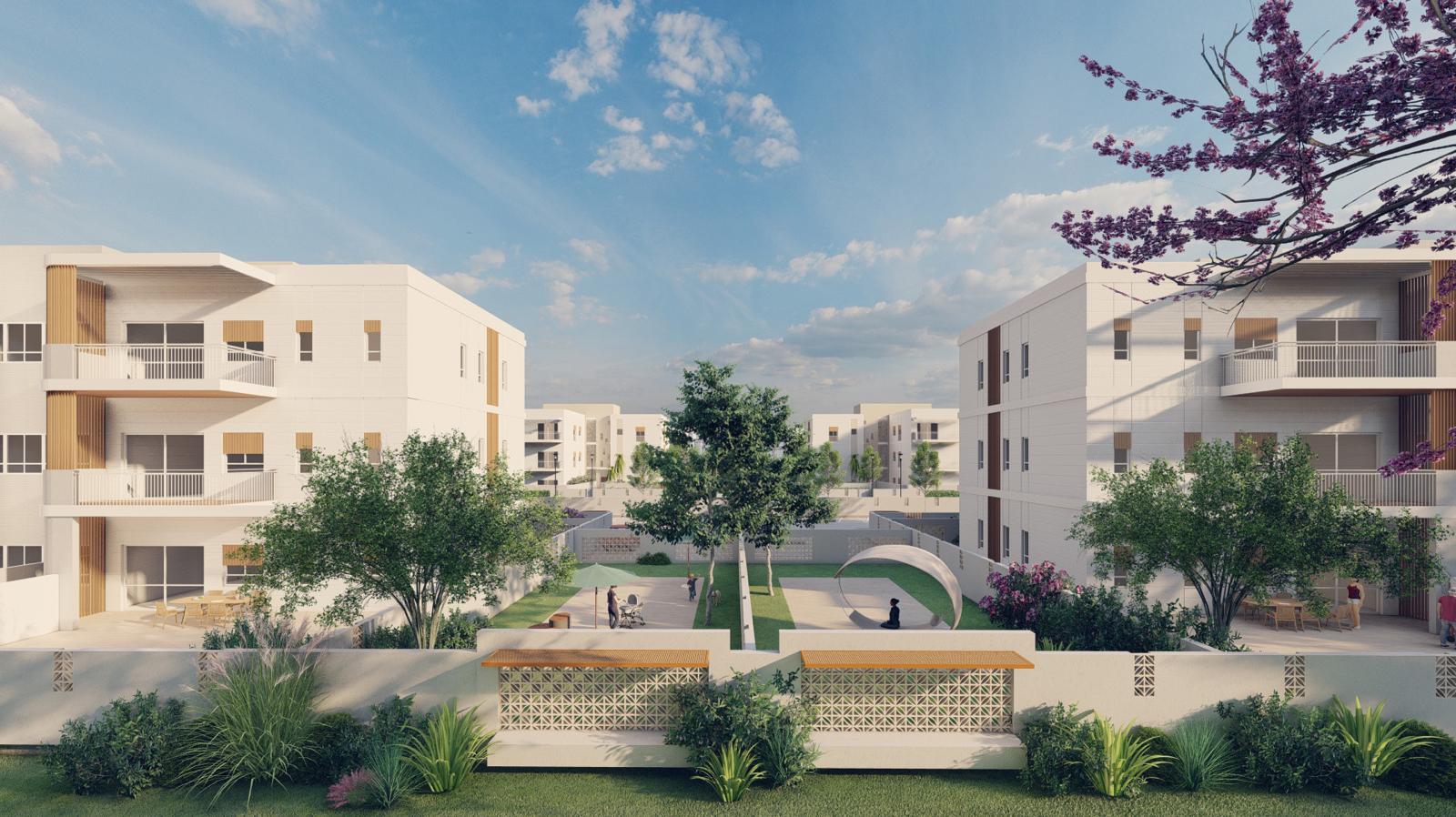 הדמיה של פרויקט אפיקי נחל באופקים – בנייני מגורים חדשים מוקפים נוף ירוק ומרחבים פתוחים