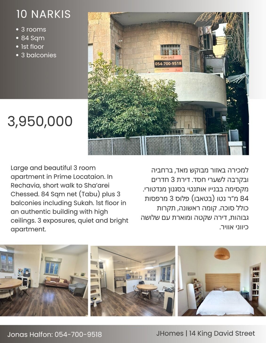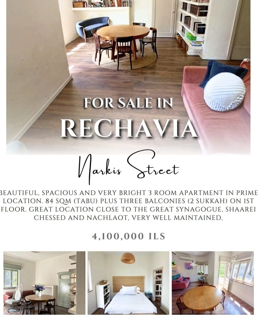 למכירה בגבול רחביה שערי חסד דירת 3 חדרים מרווחת 84 מטר בטאבו תקרות גבוהות במיוחד והרבה אור 3 מרפסות , 2 לסוכה כרגע מושכרת ב 8,500 ש"ח לחודש לפרטים נוספים וסרטון בפרטי