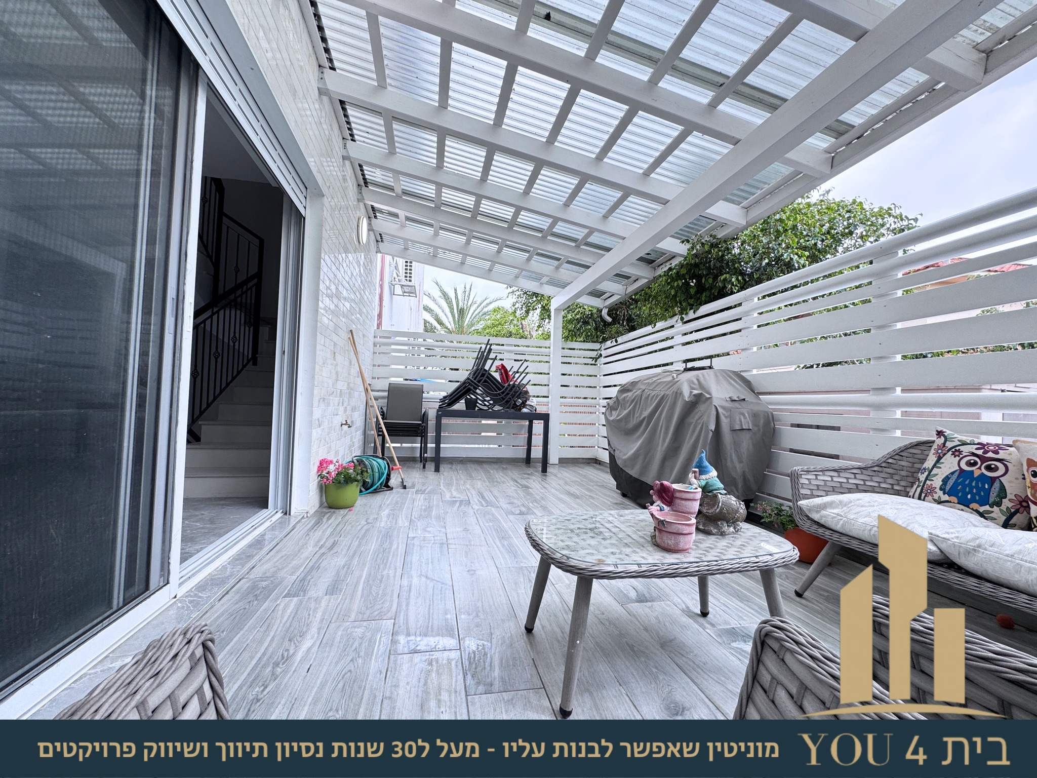 גינה מרוצפת עם פרגולה ביציאה מהסלון