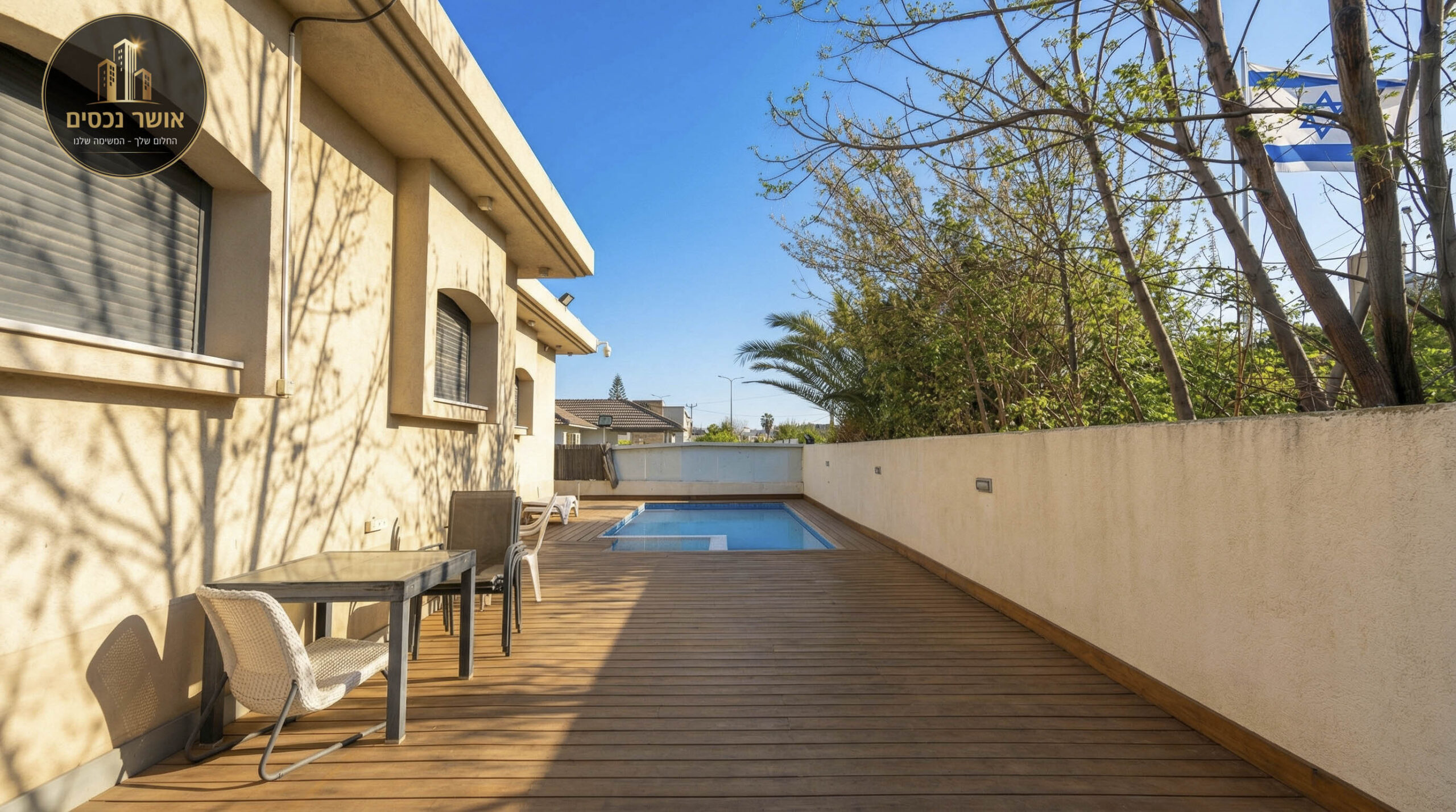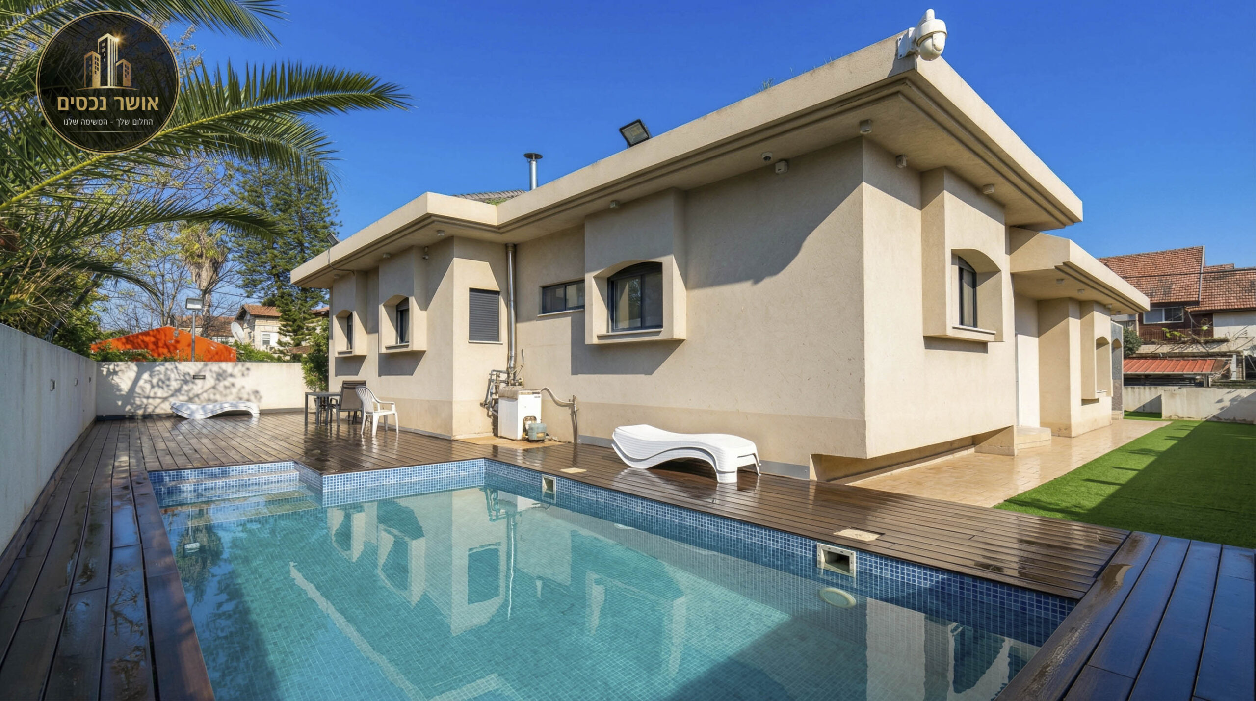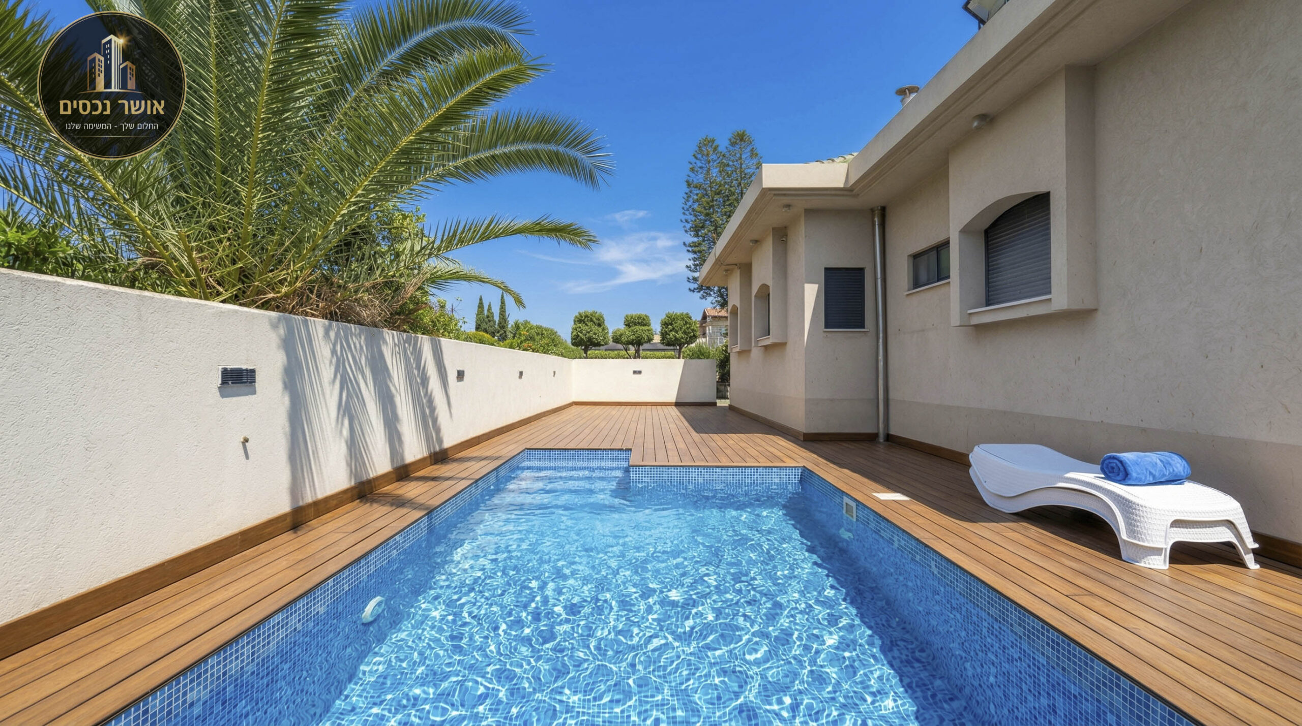בתוכה מורכב תאורה שקועה ומוארת | גינה ענקית מרוצפת היקפית | בריכה מתועשת 7*3 בנויה מפאנלים מודולארים המיוצרים מפולימרים עמידות לשנים