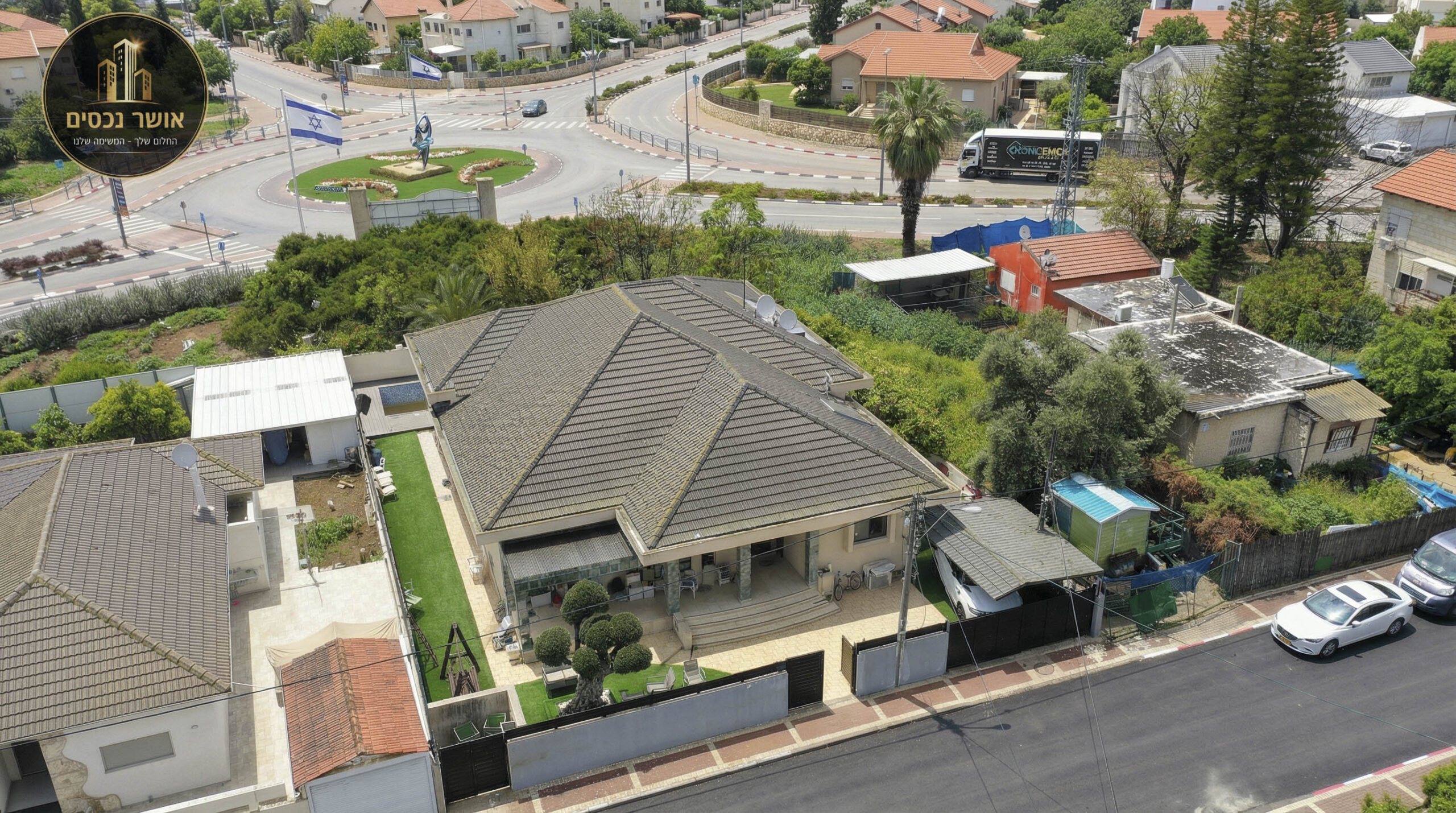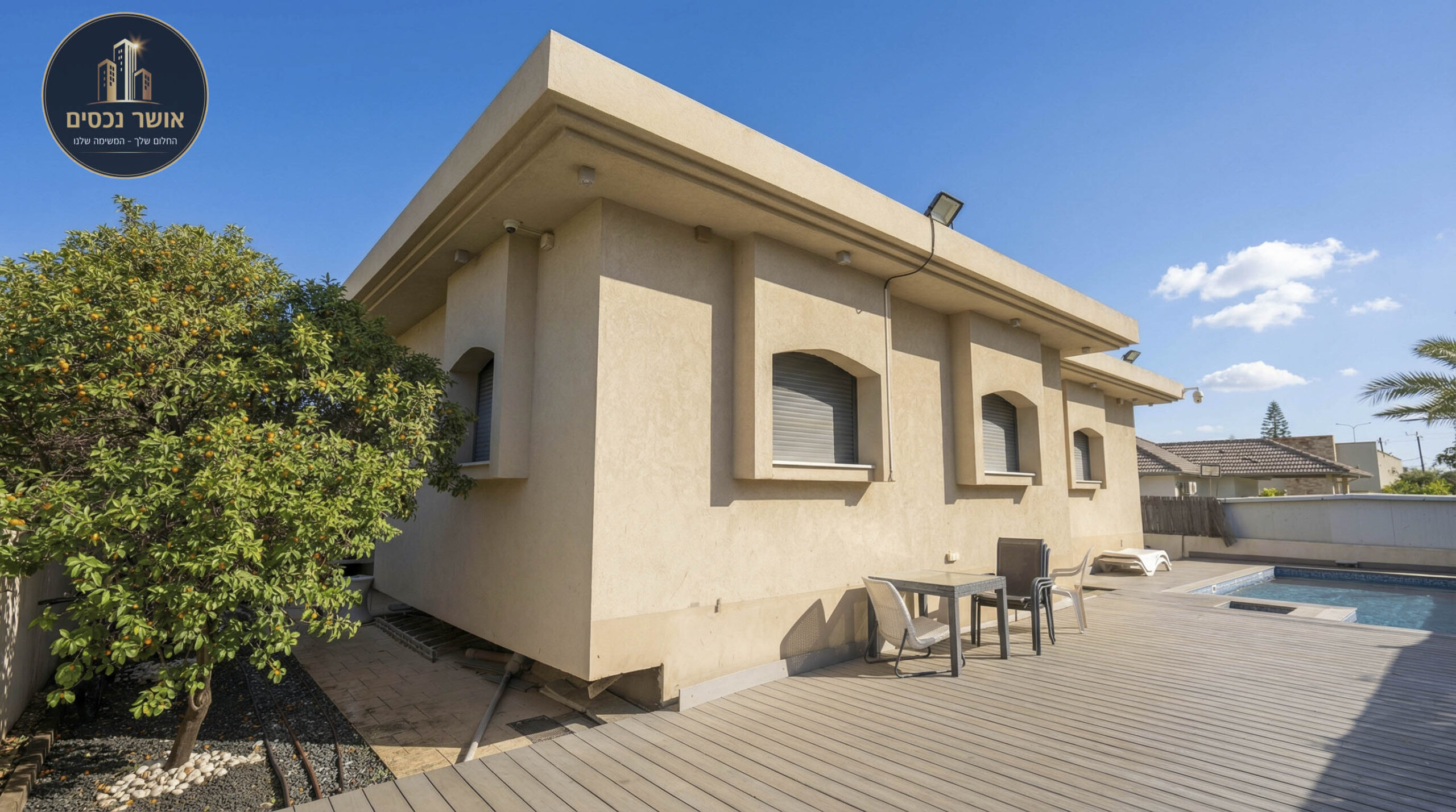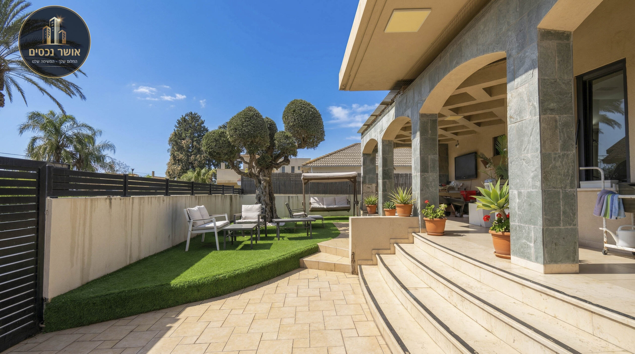 בתוכה מורכב תאורה שקועה ומוארת | גינה ענקית מרוצפת היקפית | בריכה מתועשת 7*3 בנויה מפאנלים מודולארים המיוצרים מפולימרים עמידות לשנים