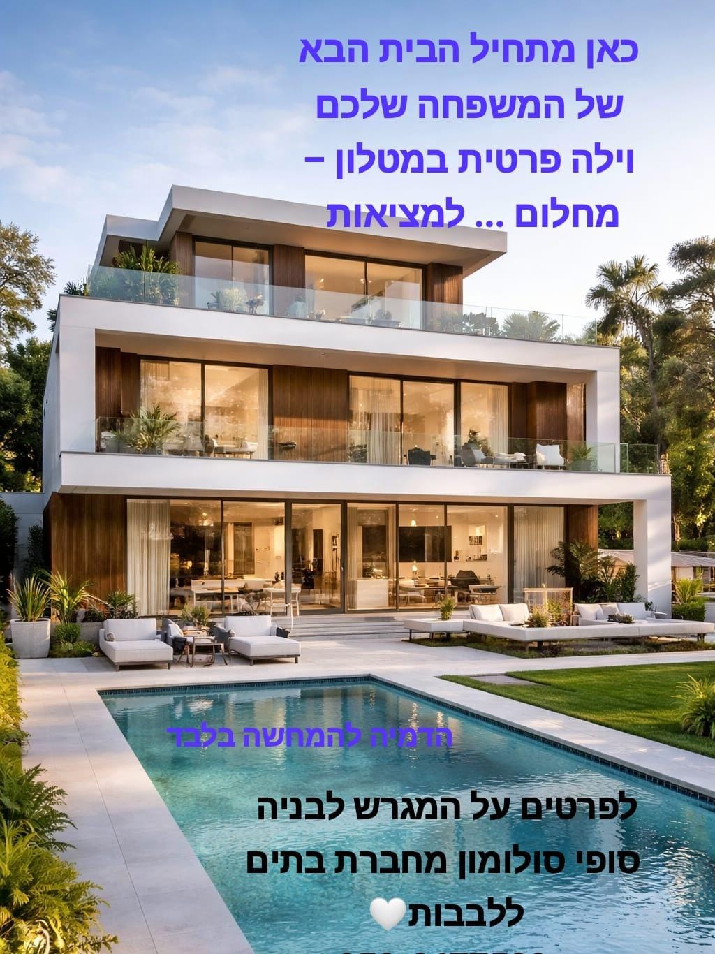 וילה בבניה בק. מטלון- פ”ת המבוקשת וילה יוקרתית בבניה למכירה בקריית מטלון, פ”ת במיקום מעולה ושקט – צמוד לפארק חדש וירוק נבנית עכשיו וילה מרהיבה בעיצוב מוקפד וברמת גימור גבוהה במיוחד 300 מ”ר בנוי – לא כולל יחידות דיור מגרש של 250 מ”ר כניסה ביוני 2026 3 מפלסים + יציאה לחצר גדולה + מרתף – שתי יחידות דיור כניסה ניפרדת להשכרה + ממ״ד צפי כניסה 01/07/2026 קריית מטלון – השקט של הכפר בלב העיר. זו ההזדמנות שלכם לרכוש וילת יוקרה במיקום הנחשק ביותר בפתח תקווה! מחיר אטרקטיבי 7,690,000!!! סופי סולומון – מחברת בתים ללבבות